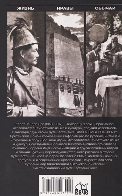 Сарат Чандра Дас (1849—1917) — выходец из семьи брахманов, получил известность благодаря двум своим путешествиям в Тибет в 1879 и 1881—1882 годах. Британский шпион, собиравший информацию по русским, китайцам и тибетцам в пору «Большой игры». Исследователь тибетского языка и культуры, составитель Большого тибетско-английского словаря, компаньон ордена Индийской империи и других почетных наград и званий. Русский перевод увлекательного рассказа о втором путешествии в Тибет не переиздавался с 1904 г., но теперь наконец доступен и в современной орфографии. Сохранены все оригинальные иллюстрации. Откройте для себя суровый мир таинственной высокогорной страны вместе с индийским п­утешественником!