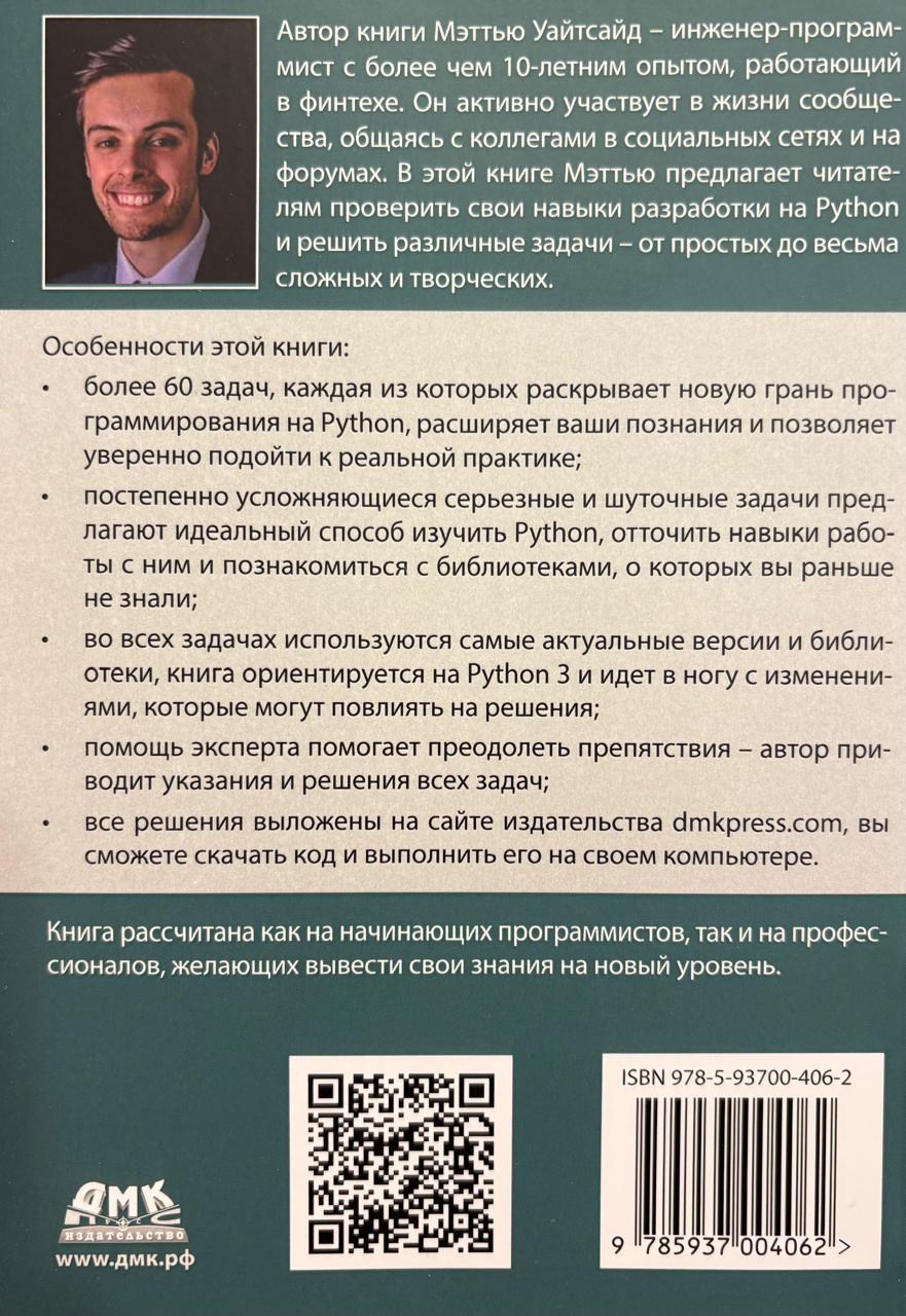 Автор книги Мэттью Уайтсайд – инженер-программист с более чем 10-летним опытом, работающий в финтехе. Он активно участвует в жизни сообщества, общаясь с коллегами в социальных сетях и на форумах. В этой книге Мэттью предлагает читателям проверить свои навыки разработки на Python и решить различные задачи – от простых до весьма сложных и творческих.