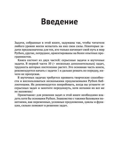 - постепенно усложняющиеся серьезные и шуточные задачи предлагают идеальный способ изучить Python, отточить навыки работы с ним и познакомиться с библиотеками, о которых вы раньше не знали;