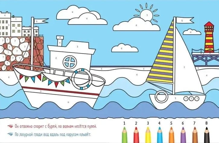 Внутри малыша ждут самолет, пароход и другие виды транспорта, а также веселые загадки, которые не оставят его равнодушным и превратят процесс раскрашивания в увлекательную игру.