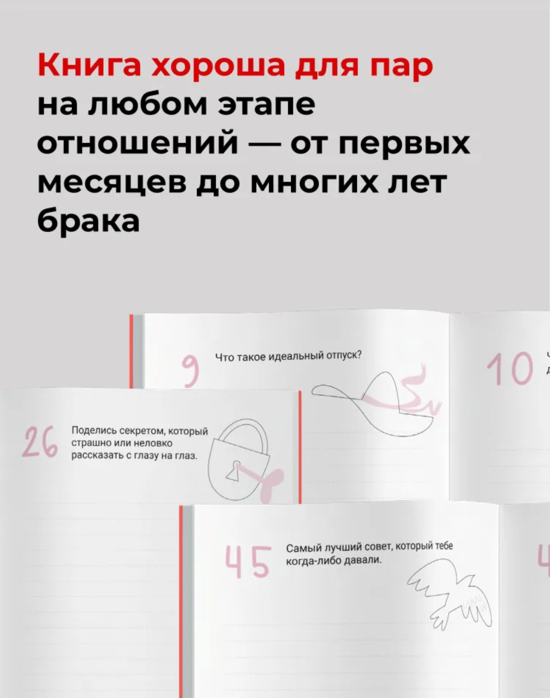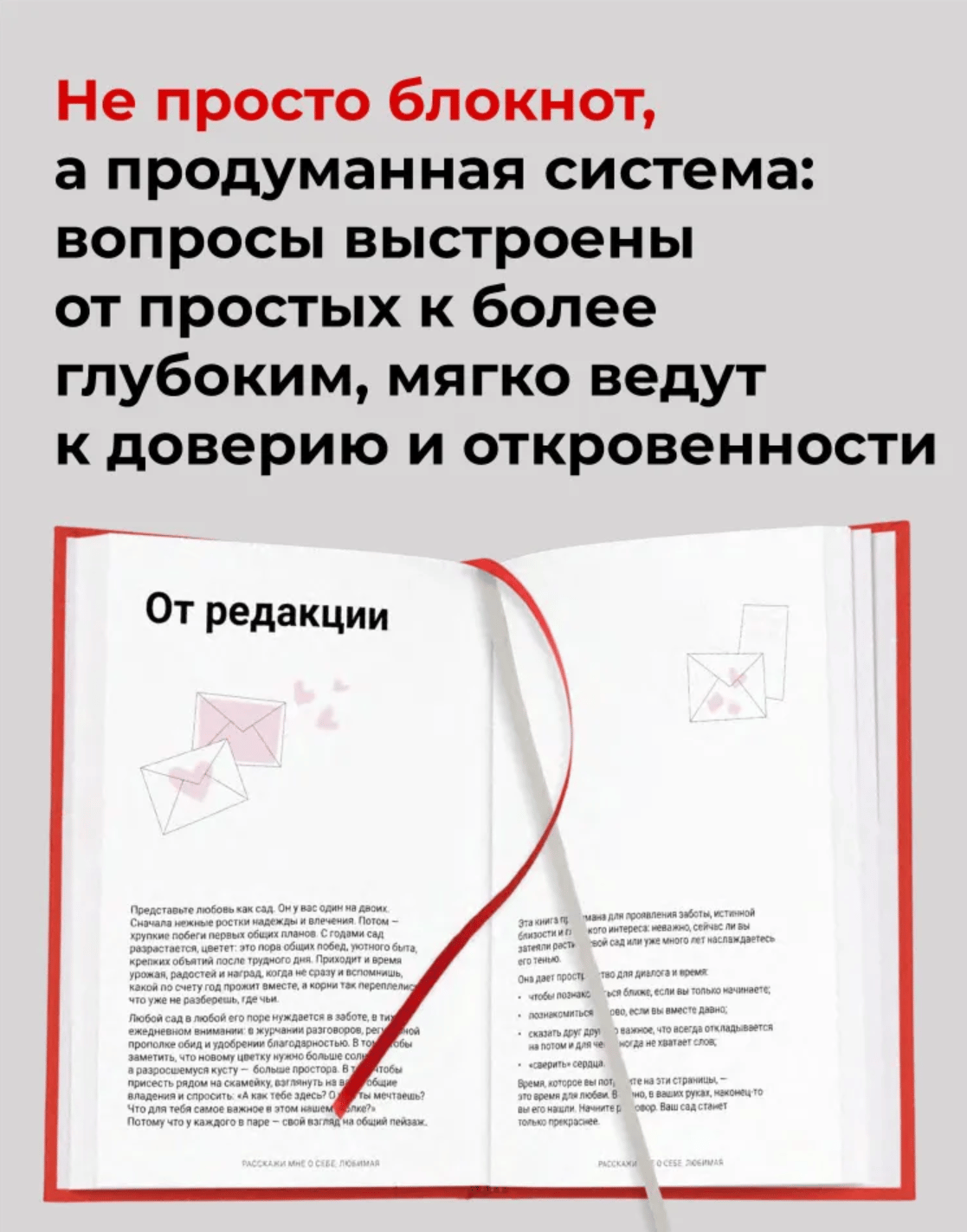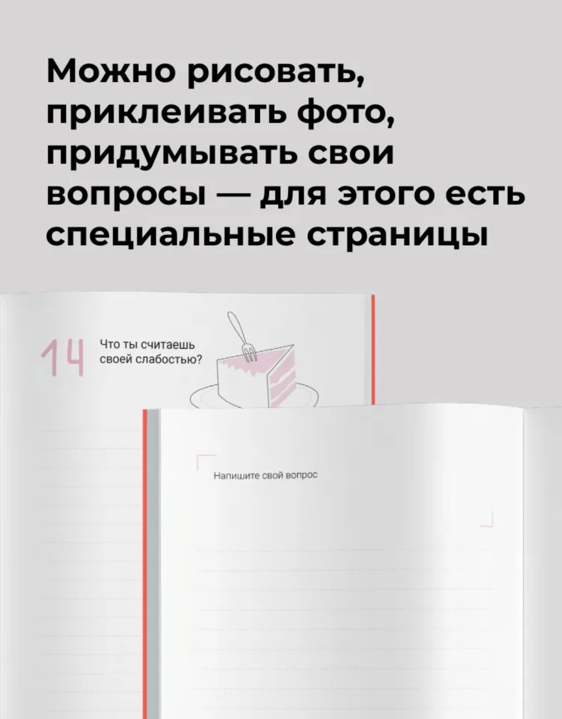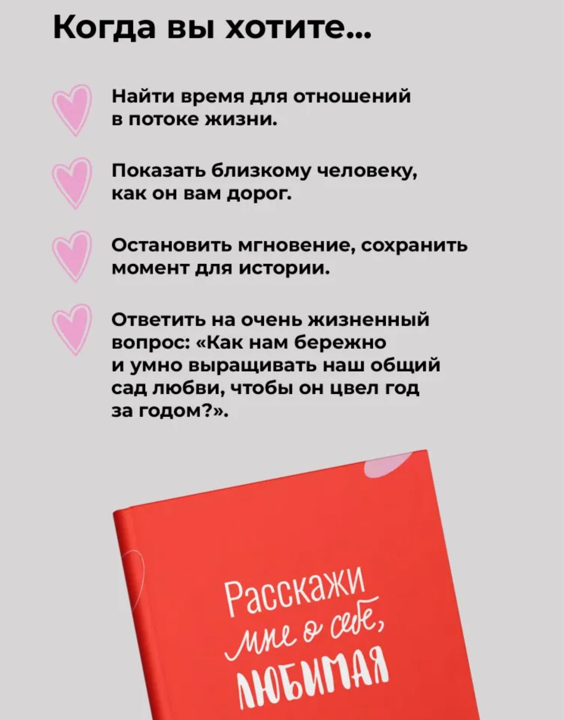 Это не просто анкета, а бережно созданное пространство для диалога. Каждый ответ — штрих к портрету любимой. Каждый ответ — мост к еще большей эмоциональной близости. Книга помогает не только сохранить воспоминания, но и открыть новые грани в, казалось бы, хорошо знакомом человеке. Ответы, рисунки и фото превратят этот дневник в уникальный артефакт, «капсулу времени».