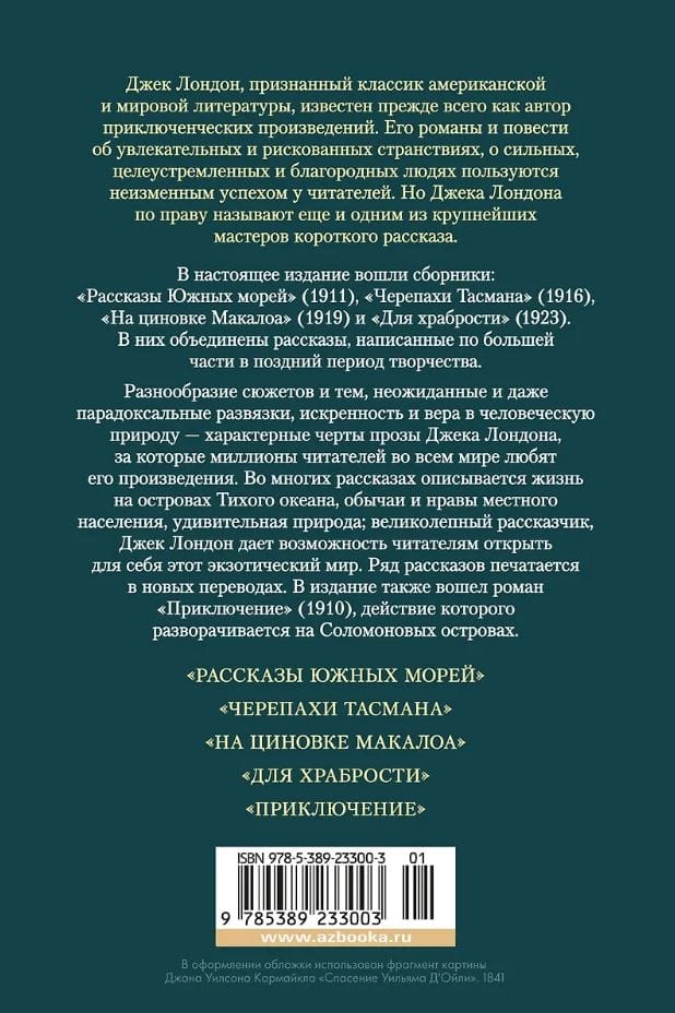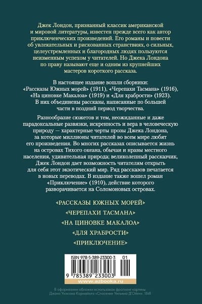Джек Лондон, признанный классик американской и мировой литературы, известен прежде всего как автор приключенческих произведений. Его романы и повести об увлекательных и рискованных странствиях, о сильных, целеустремленных и благородных людях пользуются неизменным успехом у читателей. Но Джека Лондона по праву называют еще и одним из крупнейших мастеров короткого рассказа. В настоящее издание вошли сборники: «Рассказы Южных морей» (1911), «Черепахи Тасмана» (1916), «На циновке Макалоа» (1919) и «Для храбрости» (1923). В них объединены рассказы, написанные по большей части в поздний период творчества. Разнообразие сюжетов и тем, неожиданные и даже парадоксальные развязки, искренность и вера в человеческую природу — характерные черты прозы Джека Лондона, за которые миллионы читателей во всем мире любят его произведения. Во многих рассказах описывается жизнь на островах Тихого океана, обычаи и нравы местного населения, удивительная природа; великолепный рассказчик, Джек Лондон дает возможность читателям открыть для себя этот экзотический мир. Ряд рассказов печатается в новых переводах. В издание также вошел роман «Приключение» (1910), действие которого разворачивается на Соломоновых островах.