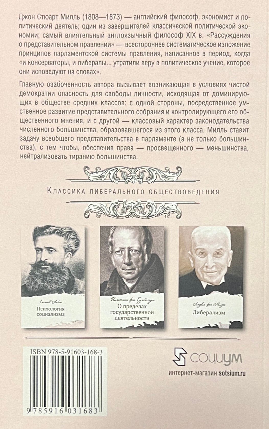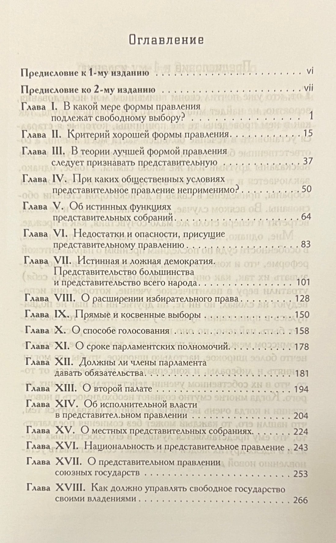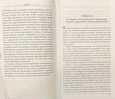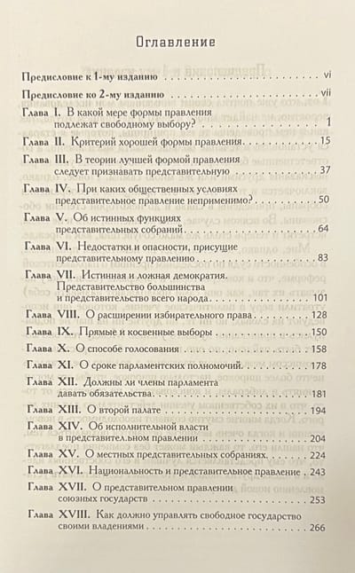 Книга представляет собой всестороннее систематиче-ское изложение принципов парламентской системы прав-ления, написанное в период, когда «и консерваторы, и ли-бералы... утратили веру в политическое учение, которое они исповедуют на словах». Главную озабоченность авто-ра вызывает возникающая в условиях чистой демократии опасность для свободы личности, исходящая от доминирующих в обществе средних классов: с одной стороны, посредственное умственное развитие представительного собрания и контролирующего его общественного мнения, и с другой — классовый характер законодательства чис-ленного большинства, образовавшегося из этого класса. Милль ставит задачу всеобщего представительства в пар-ламенте (а не только большинства), с тем чтобы, обеспе-чив права — просвещенного — меньшинства, нейтрали-зовать тиранию большинства.