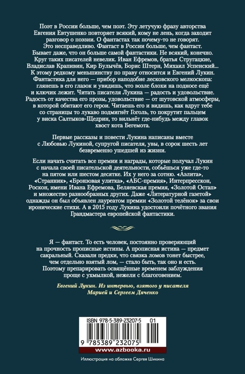 Поэт в России больше, чем поэт. Эту летучую фразу авторства Евгения Евтушенко повторяет всякий, кому не лень, когда заходит разговор о поэзии. О фантастах так почему-то не говорят. Это несправедливо. Фантаст в России больше, чем фантаст. Бывает даже, что он больше самой фантастики. Не всякий, конечно. Круг таких писателей невелик. Иван Ефремов, братья Стругацкие, Владислав Крапивин, Кир Булычёв, Борис Штерн, Михаил Успенский… К этому редкому меньшинству по праву относится и Евгений Лукин. Фантастика для него — прибор наподобие лесковского мелкоскопа: глянешь в его глазок и увидишь, что возле блохи на подносе ещё и ключик лежит. Читать писателя Лукина — радость и удовольствие. Радость от качества его прозы, удовольствие — от шутовской атмосферы, в которой обитают его герои. Читаешь его и видишь, как вдруг тебе со страницы то лукаво подмигнёт Гоголь, то покрутит пальцем у виска Салтыков-Щедрин, то вильнёт где-нибудь между главок хвост кота Бегемота. Первые рассказы и повести Лукина написаны вместе с Любовью Лукиной, супругой писателя, увы, в сорок шесть лет безвременно ушедшей из жизни. Если начать считать все премии и награды, которые получал Лукин с начала своей писательской деятельности, собьёшься уже где-то на пятом или шестом десятке. Их у него за сотню. «Аэлита», «Странник», «Бронзовая улитка», «АБС-премия», Интерпресскон, Роскон, имени Ивана Ефремова, Беляевская премия, «Золотой Остап» и множество разнообразных других. Даже «Литературной газетой» однажды он был объявлен лауреатом премии «Золотой телёнок» за свои иронические стихи. А в 2015 году Лукина удостоили почётного звания Грандмастера европейской фантастики.