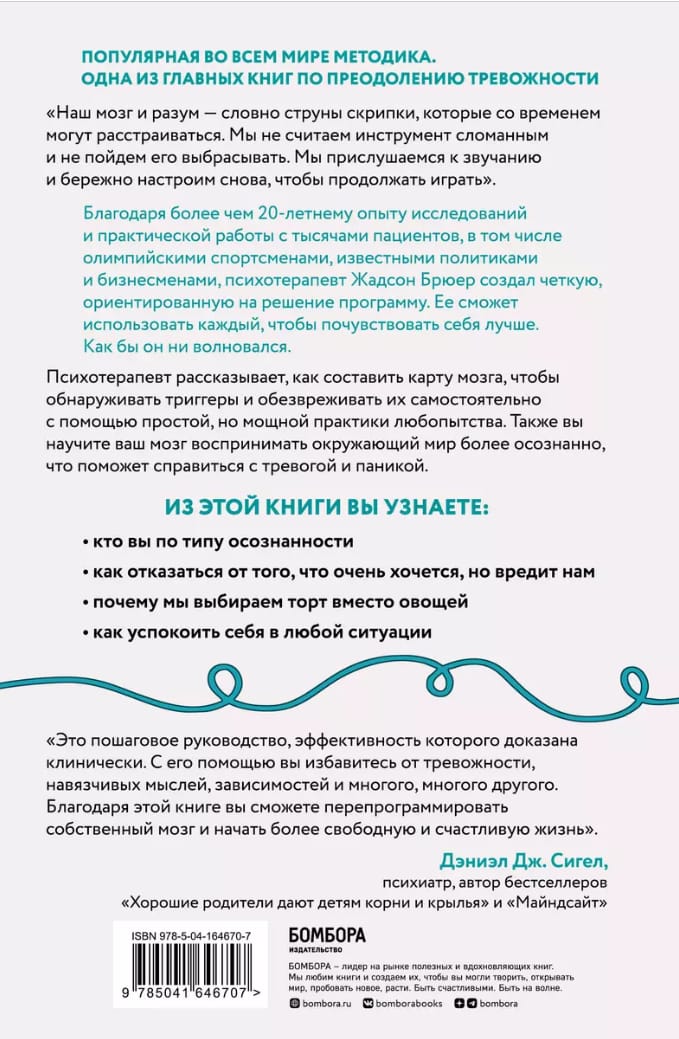 Тревога живет в той части мозга, которая сопротивляется рациональному мышлению. Мы застреваем в петлях привычек беспокойства, из которых не можем найти выход или бессильны использовать силу воли. Психотерапевт рассказывает, как составить карту мозга, чтобы обнаруживать триггеры и обезвреживать их самостоятельно с помощью простой, но мощной практики любопытства. Также вы научите мозг воспринимать окружающий мир более осознанно, что поможет справиться с тревогой и паникой.