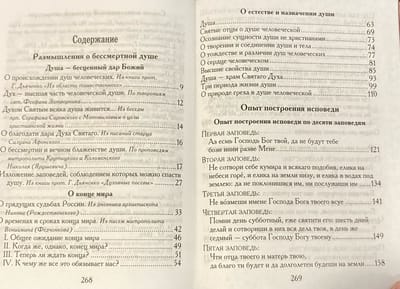 Основные темы «Размышления о бессмертной душе»: о происхождении душ человеческих; о естестве и назначении души; о творении и соединении души и тела; о природе греха в душе человеческой; дух — высшая часть человеческой души; о бессмертии и вечном блаженстве души. Свои размышления о душе отец Иоанн подкрепляет обширными выписками из творений святых отцов и трудов отечественных подвижников благочестия. Он говорит о том, что «забота о душе должна быть для каждого из нас целожизненным трудом». «Опыт построения исповеди» представляет два цикла бесед старца. Первый цикл — по десяти заповедям Божиим; второй цикл — по девяти заповедям блаженства. Это произведение научает внимательно и детально готовиться к таинству исповеди. Серьезные вопросы излагаются у отца Иоанна в доступной форме и при этом четко и многогранно.