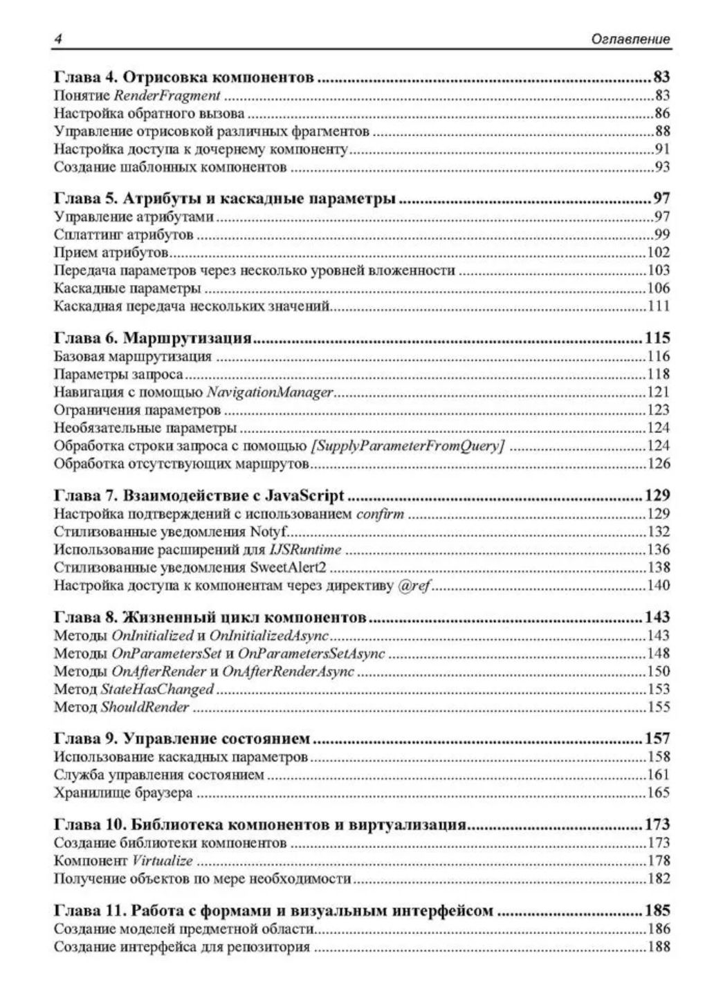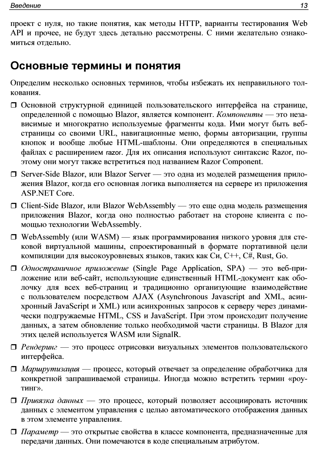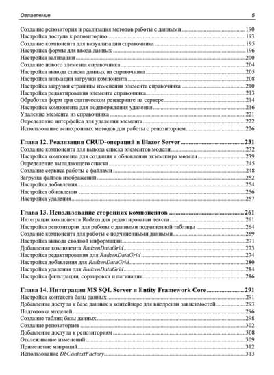 Рассмотрены особенности создания веб-приложений с помощью фреймворка Blazor с обновленной структурой, появившейся с выходом .NET 8. Приведены основные понятия, описана архитектура приложений для различных моделей хостинга (Blazor Server и Blazor WebAssembly) и даны практические примеры реализации таких приложений. Показаны способы привязки данных, настройки обратного вызова с использованием событий. Разобрано создание моделей и репозиториев для хранения данных, управление объектами при осуществлении CRUD-операций. Подробно описаны функции, специфичные для Blazor. Рассматриваются методы настройки рендеринга компонентов, их жизненный цикл, показаны способы создания и применения универсальных компонентов, предложены варианты внедрения готовых библиотек и реализации взаимодействия с JavaScript. Книга ориентирована на разработчиков, имеющих базовые знания о .NET, C# и веб-технологиях (HTML, JavaScript и CSS), желающих овладеть основами веб-разработки с помощью Blazor. Электронный архив на сайте издательства содержит результаты выполнения всех рассмотренных в книге проектов.