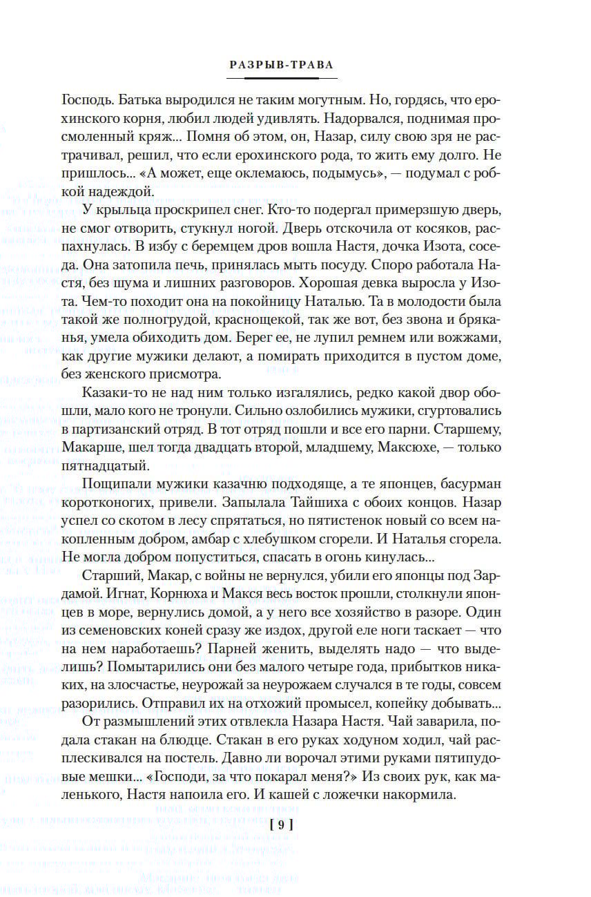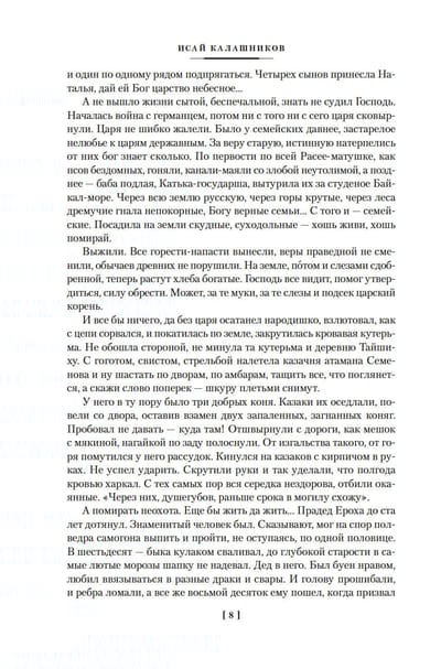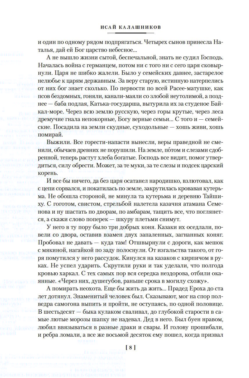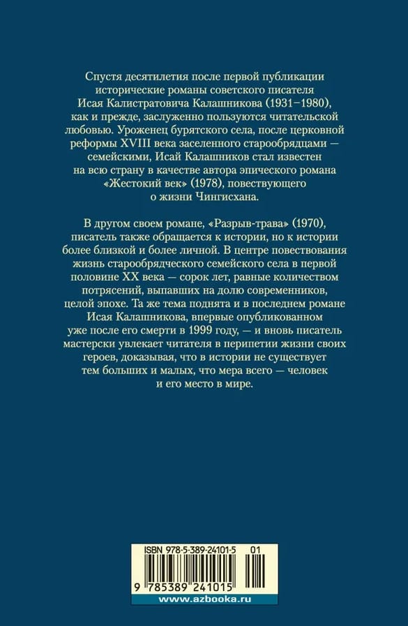 Исай Калашников, уроженец бурятского села, после церковной реформы XVIII века заселенного старообрядцами — семейскими, стал известен на всю страну после публикации эпического романа «Жестокий век» (1978), повествующего о жизни Чингисхана. В другом своем романе, «Разрыв-трава» (1970), писатель также обращается к истории, но к истории более близкой и более личной. В центре повествования жизнь старообрядческого семейского села в первой половине XX века — сорок лет, равные количеством потрясений, выпавших на долю современников, целой эпохе. Та же тема поднята и в последнем романе Исая Калашникова, впервые опубликованном уже после его смерти в 1999 году, — и вновь писатель мастерски увлекает читателя в перипетии жизни своих героев, доказывая, что в истории не существует тем больших и малых, что мера всего — человек и его место в мире.