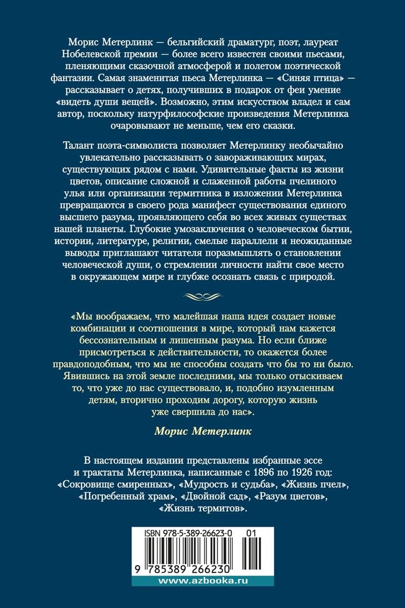 В настоящем издании представлены избранные эссе и трактаты Мориса Метерлинка, написанные с 1896 по 1926 год: «Сокровище смиренных», «Мудрость и судьба», «Жизнь пчел», «Погребенный храм», «Двойной сад», «Разум цветов», «Жизнь термитов».