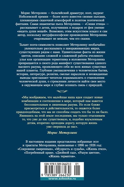 Морис Метерлинк — бельгийский драматург, эссеист и поэт, лауреат Нобелевской премии, — более всего известен своими пьесами, пленяющими сказочной атмосферой и полетом поэтической фантазии. Самая знаменитая пьеса Метерлинка — «Синяя птица» — рассказывает о детях, получивших в подарок от феи умение «видеть души вещей». Возможно, этим искусством владел и сам автор, поскольку натурфилософские произведения Метерлинка очаровывают не меньше, чем его сказки.