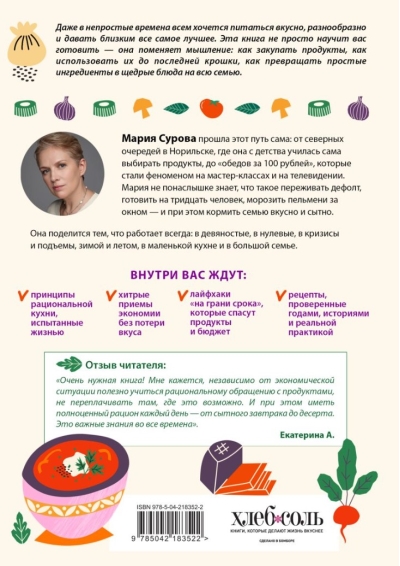 Мария Сурова — актриса, телеведущая и автор кулинарных книг — в этом вопросе совсем не теоретик: разные жизненные обстоятельства научили ее относиться к еде рационально, а поварской опыт позволил не ограничиваться «кашей из топора», а придумать многочисленные блюда, которые отнесутся к вашему кошельку бережно.