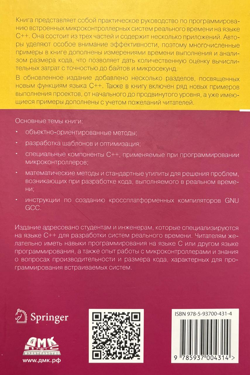 Книга представляет собой практическое руководство по программированию встроенных микроконтроллерных систем реального времени на языке C++. Она состоит из трех частей и содержит несколько приложений. Авторы уделяют особое внимание эффективности, поэтому многочисленные примеры в книге дополнены измерениями времени выполнения и анализом размера кода, что позволяет дать количественную оценку вычислительных затрат с точностью до байтов и микросекунд.