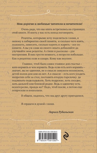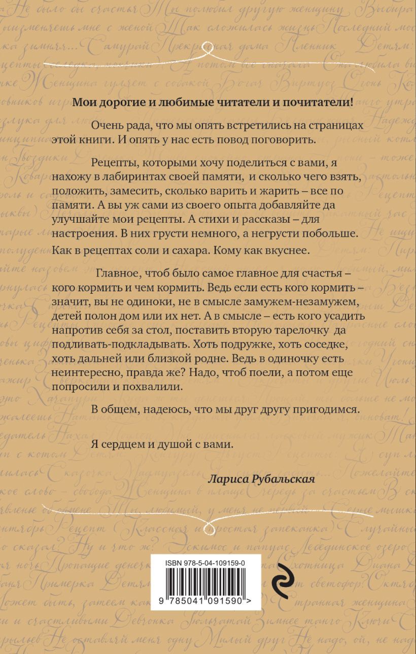 Сердечность и теплота Ларисы Рубальской помогли уже многим ее поклонникам. Ее стихи, наполненные любовью и нежностью, близки и понятны каждому слушателю. Когда она рассказывает непридуманные истории о жизни в своих стихах и рассказах, создается впечатление, что она обращается к каждому из нас.