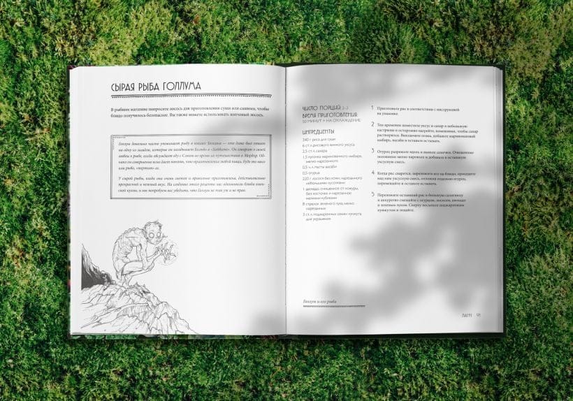В этой книге вы найдете более 75 рецептов, которые составлены на основе упоминаемых в «Хоббите» и «Властелине колец» блюд и напитков.  Рецепты составлены в соответствии с шестью ежедневными приемами пищи хоббитов: завтрак, второй завтрак, перекус в 11 часов, обед, послеобеденный чай, ужин. Напитки, которые имеют большое значение в мирах Толкина, вынесены в отдельный раздел. «Завтрак путника», эльфийские булочки, рыба Голлума, орочье питье и другие блюда перенесут вас в волшебный мир Средиземья.