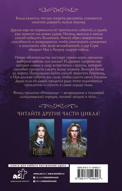 Друзья еще не оправились от трагических событий, а судьба уже наносит им новые удары: Ингрид выжила и нашла способ победить Хельвинов, Микке обрел невероятные способности и возвращается, чтобы уничтожить соперника и подчинить себе волю возлюбленной, а дар Сары обещает Нее и Бьорну скорую гибель. Новые обстоятельства поставят героев перед прежним выбором: любовь или жизнь? И древнее пророчество заставит лицом к лицу встретиться с врагом, который способен принести смерть всему живому. Великая битва на пороге. Необходимо найти способ, чтобы защитить Реннвинд, и Нея должна собрать все силы, чтобы спасти своих близких. Даже если ей самой придется ради этого подчиниться проклятию и ступить в самое сердце тьмы. Финал трилогии «Реннвинд» — возвращение в туманный скандинавский городок, полный загадок и тайн…