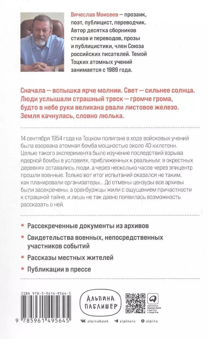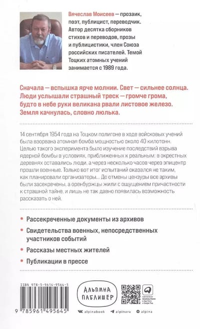 14 сентября 1954 года на Тоцком полигоне под Оренбургом была взорвана атомная бомба мощностью около 40 килотонн. В рамках эксперимента по изучению последствий ядерного взрыва уже спустя несколько часов через его эпицентр прошли военные в костюмах химической защиты. Секретная операция под кодовым названием «Снежок» обернулась катастрофой: более 45 000 военных и 10 000 мирных жителей подверглись воздействию смертоносной радиации. Эта книга стала результатом более чем двадцатилетней исследовательской работы журналиста Вячеслава Моисеева. Он начал по крупицам собирать информацию еще в 1980-е годы, внимательно изучив свидетельства очевидцев атомного взрыва, а затем — рассекреченные документы из архивов и тщательно отобранные публикации в СМИ. Его книга — об ответственности организаторов Тоцкого эксперимента перед невольными участниками репетиции апокалипсиса, перед Россией и самой историей.