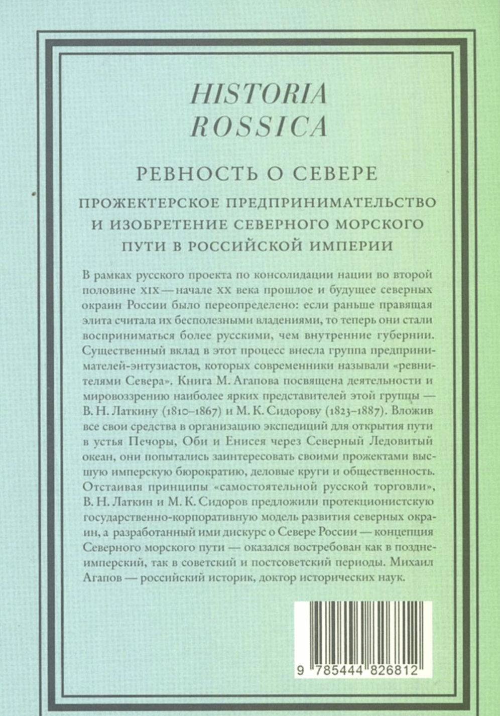 В рамках русского проекта по консолидации нации во второй половине XIX — начале XX века прошлое и будущее северных окраин России было переопределено: если раньше правящая элита считала их бесполезными владениями, то теперь они стали восприниматься более русскими, чем внутренние губернии. Существенный вклад в этот процесс внесла группа предпринимателей-энтузиастов, которых современники называли «ревнителями Севера». Книга М. Агапова посвящена деятельности и мировоззрению наиболее ярких представителей этой группы — В. Н. Латкину (1810–1867) и М. К. Сидорову (1823–1887). Вложив все свои средства в организацию экспедиций для открытия пути в устья Печоры, Оби и Енисея через Северный Ледовитый океан, они попытались заинтересовать своими прожектами высшую имперскую бюрократию, деловые круги и общественность. Отстаивая принципы «самостоятельной русской торговли», В. Н. Латкин и М. К. Сидоров предложили протекционистскую государственно-корпоративную модель развития северных окраин, а разработанный ими дискурс о Севере России — концепция Северного морского пути — оказался востребован как в позднеимперский, так в советский и постсоветский периоды. Михаил Агапов — российский историк, доктор исторических наук.