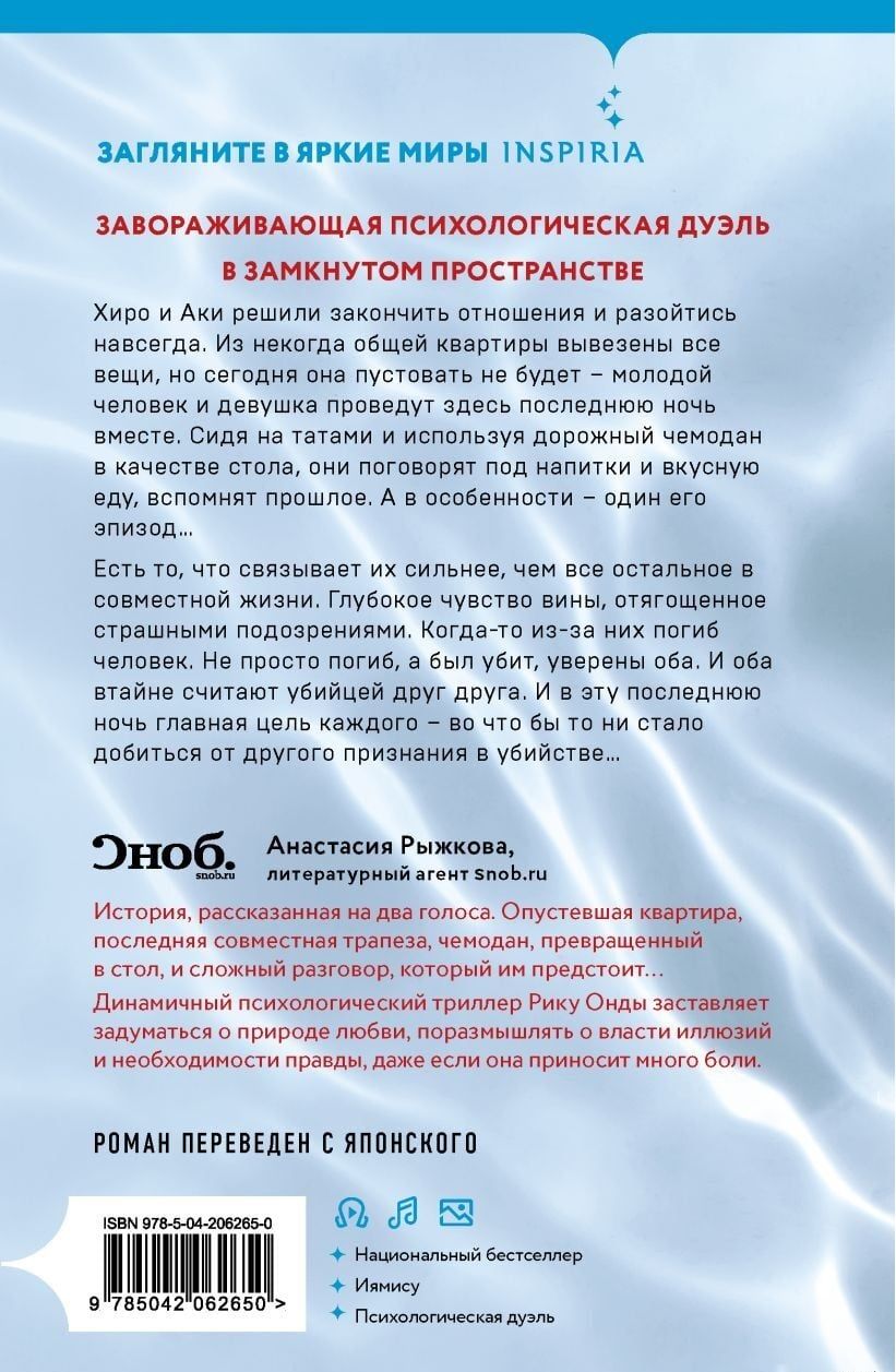 Герметичный триллер от лауреата остросюжетной премии № 1 в Японии — «Японской детективной литературы». Завораживающая психологическая дуэль в замкнутом пространстве.