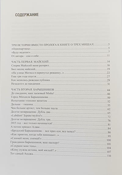 Героями книги «Рига и три ее Миши» являются три выдающихся рижанина: Миша Майский, Михаил Барышников и Михаил Таль. В детстве все трое жили в центре Риги и впоследствии стали легендами Риги и Латвии. Все три очаровали автора книги - известного культурного журналиста Андрея Шаврея - на долгие годы. В книге он собрал свои интервью, наблюдения, впечатления от спектаклей, концертов и других художественных мероприятий. Будучи прекрасным рассказчиком, Шаврей со свойственным ему усердием прибавляет к каждому событию рассказ о переживаниях и наблюдениях, связанных с этим событием. Книга пронизана вопросом, как вообще или одновременно в Риге могла появиться такая плеяда выдающихся личностей. Сам автор говорит о своей книге: «Ее можно читать и как приключенческий роман, и как детектив, и как документальный фильм». Книга издана на родном русском языке автора, что позволяет максимально насладиться его уникальным стилем письма и интонацией.