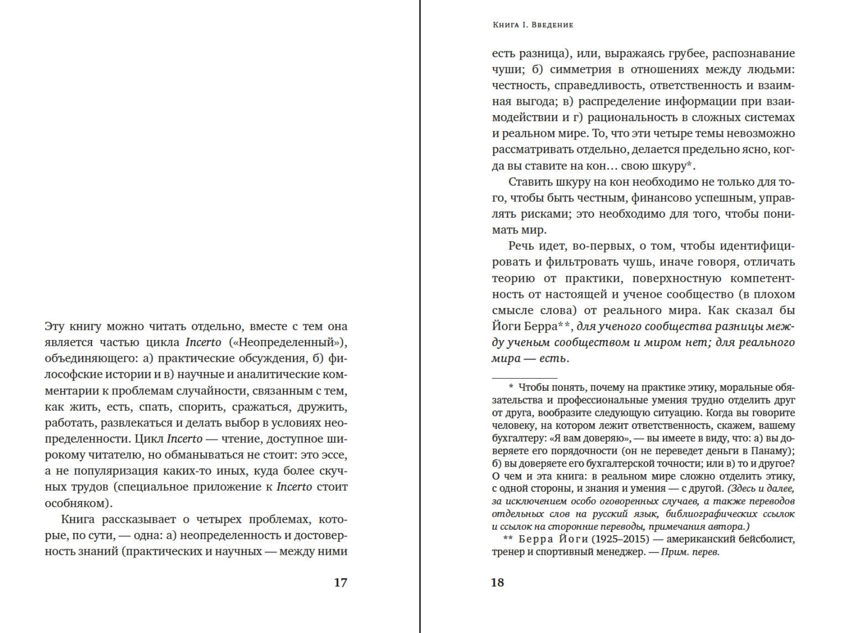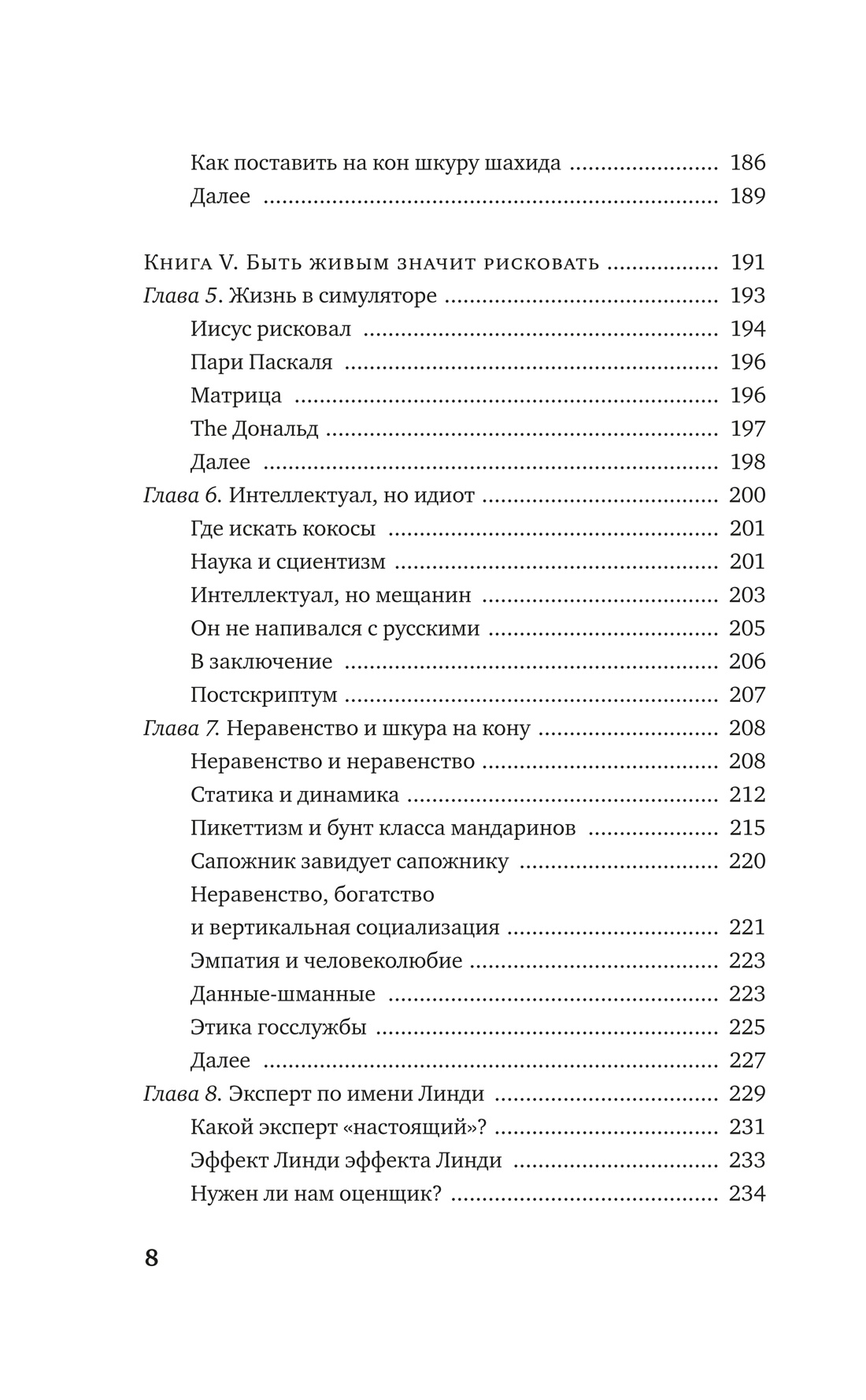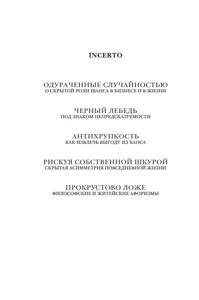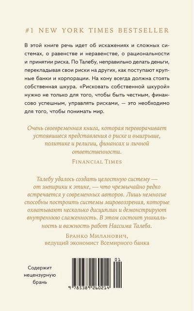 В своей резко провокационной и одновременно предельно прагматичной книге неподражаемый Нассим Талеб рассказывает, как важно идентифицировать и фильтровать чушь, отличать теорию от практики, поверхностную компетентность от настоящей. Вы узнаете, что такое рациональность в сложных системах и реальном мире, симметрия и асимметрия и в чем состоит логика принятия рисков. Наполняя новым смыслом привычные понятия, такие как «справедливое общество», «профессиональный успех», «личная ответственность», и не боясь задеть эго признанных кумиров, Талеб развенчивает лицемерие идеологов военных интервенций в Ирак и Ливию; фиаско нобелевских лауреатов по экономике, разоривших банки и инвестиционные фонды; лживых религиозных проповедников. На примерах Хаммурапи и Иисуса Христа, римских и византийских императоров, философов-стоиков и современных успешных бизнесменов Талеб показывает, что главное качество, объединяющее их всех, — «ставить на кон свою шкуру и душу», а не переносить риск на других.
