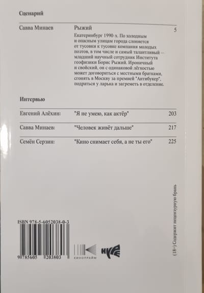 В книгу вошел киносценарий «Рыжий» Саввы Минаева и его рассказ о работе над картиной, а также интервью с режиссером фильма Семеном Серзиным и исполнителем заглавной роли Евгением Алехиным.