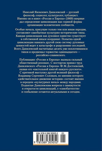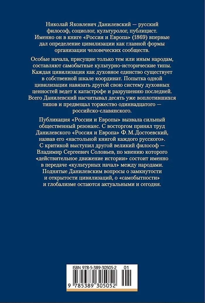 Николай Яковлевич Данилевский — русский философ, социолог, культуролог, публицист. Именно он в книге «Россия и Европа» (1869) впервые дал определение цивилизации как главной формы организации человеческих сообществ. Особые начала, присущие только тем или иным народам, составляют самобытные культурно-исторические типы. Каждая цивилизация как духовное единство существует в собственной шкале координат. Попытка одной цивилизации навязать другой свою систему духовных ценностей ведет к катастрофе и разрушению последней. Всего Данилевский насчитывал десять уже воплотившихся типов и предвещал торжество одиннадцатого — российско-славянского.