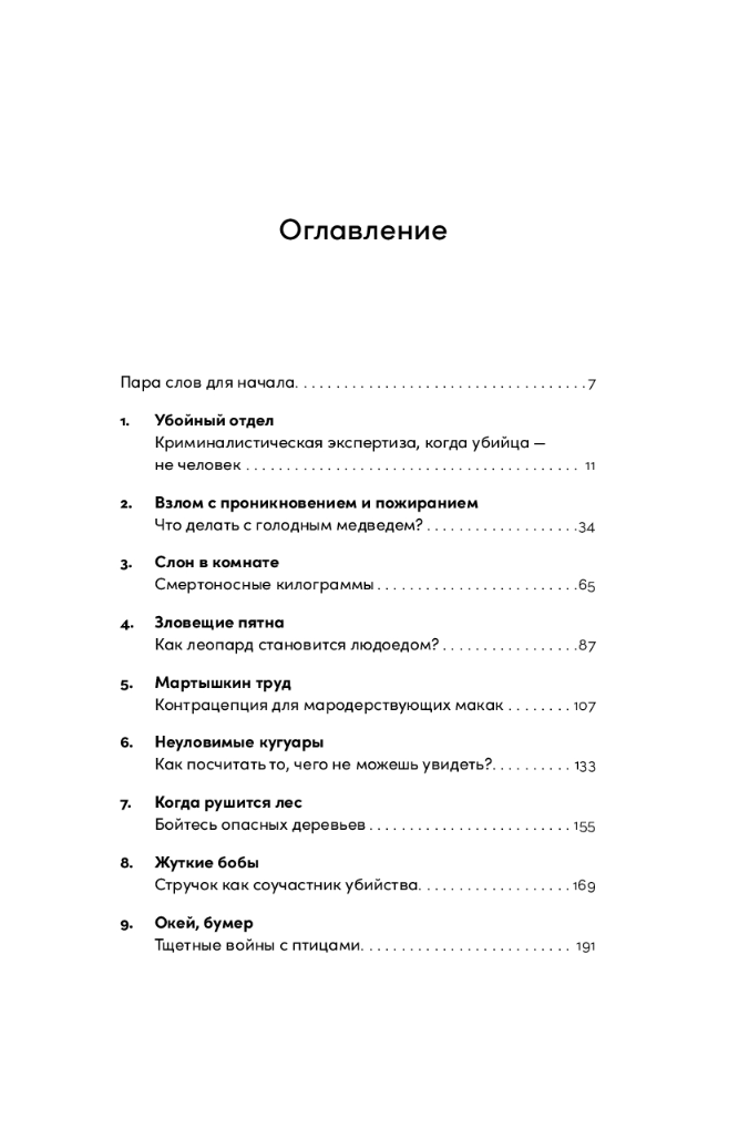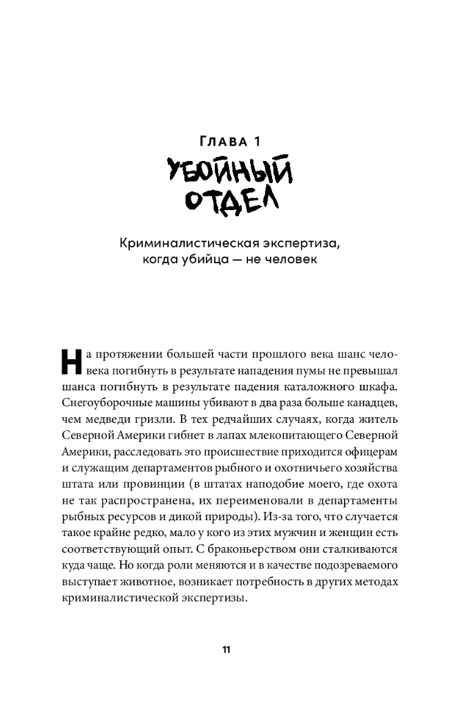 Вместе с читателем Роуч буквально ходит по пятам за криминалистами, расследующими нападения диких зверей на человека, за специалистами по конфликтам людей и слонов, за менеджером по работе с медведями... При этом, рассказывая о дикой природе, нарушающей человеческие законы, Роуч ничуть не меньше рассказывает о самом человечестве – и приходит к выводу, что когда дело касается «‎проблемных»‎ животных, проблемой – как, кстати, и ее решением – чаще всего оказываются люди.