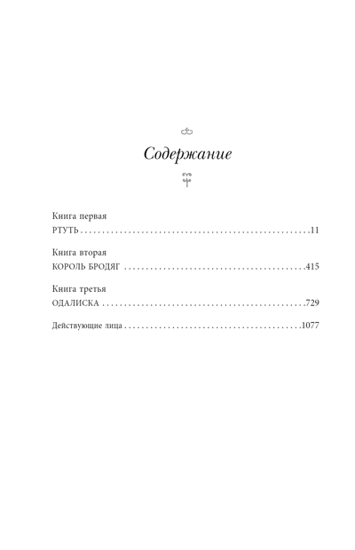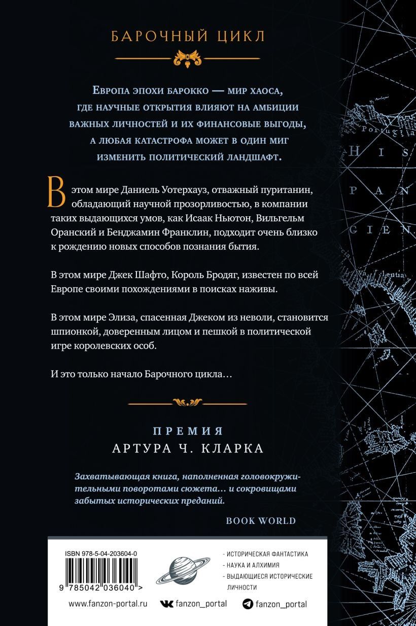 Даниель Уотерхауз, одновременно и блестящий ученый, и строгий пуританин, стремится познать все тайны вселенной. Алхимия является одним путей к знанию, но видя работу своих гениальных коллег, Даниель отвергает эту научную дисциплину. Тем временем Король Бродяг, он же Джек Шафто, становится европейской легендой благодаря своим похождениям в поисках наживы. Он спасает из турецкого гарема талантливую Элизу, благодаря чему у той появляется шанс стать герцогиней и шпионской королевских особ. И это только начало. Историко-фантастическая эпопея с интригами, приключениями и волнениями на фоне политических потрясений начала XVIII века и зарождения современной науки.