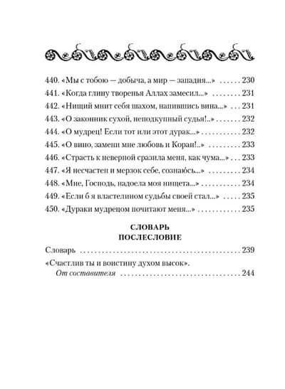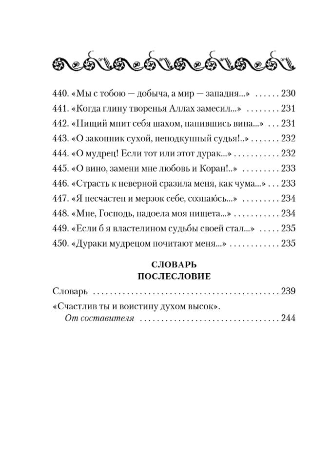 Знаменитые четверостишия-рубаи классика персидской поэзии и великого философа Омара Хайяма (ок. 1048 — ок. 1123) переводятся на русский язык уже более ста лет, но с особым успехом — начиная с 70-х годов XX века. Такой всесветной известности, как Омар Хайям, не знают другие великие поэты Востока. Его рубаи на устах у всех, кто любит поэзию: написанные почти тысячу лет назад, они актуальны и сегодня. Читать Хайяма — значит, видеть жизнь во всех ее красках. В сборник, который вы держите в руках, вошли рубаи, переведенные замечательным поэтом и переводчиком восточной поэзии Германом Плисецким.