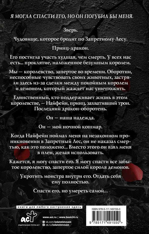 Зверь. Чудовище, которое бродит по Запретному Лесу. Принц дракон. Его постигла участь худшая, чем смерть. У всех нас есть... проклятие, наложенное безумным королем. Мы — королевство, запертое во времени. Оборотни, неспособные чувствовать своих животных, застряли здесь из за сделки между покойным королем и демоном, который жаждет нас уничтожить. Единственный, кто поддерживает жизнь в этом королевстве, — Нифейн, принц, захвативший трон. Последний дракон оборотень. Он — наша надежда. Он — мой ночной кошмар. Когда Нифейн поймал меня на незаконном проникновении в Запретный Лес, он не наказал смертью, как это положено... Вместо этого он взял меня в плен, желая использовать. Кажется, я могу спасти его. Я могу спасти все забытое королевство, запертое силой короля демонов. Укротить монстра внутри его. Отдать себя ему полностью. Спасти его, но умереть самой...