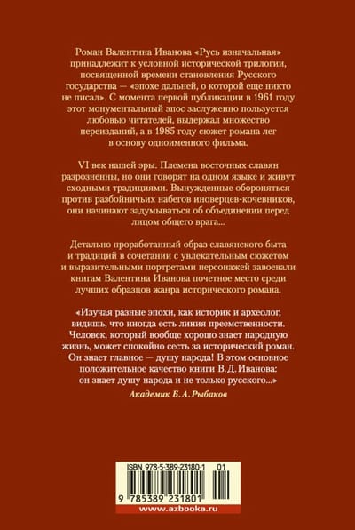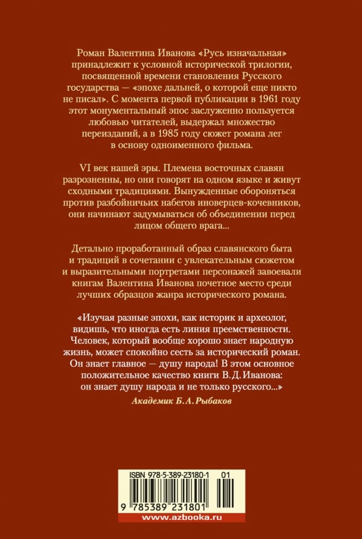 Роман Валентина Иванова «Русь изначальная» принадлежит к условной исторической трилогии, посвященной времени становления Русского государства — «эпохе дальней, о которой еще никто не писал». С момента первой публикации в 1961 году этот монументальный эпос заслуженно пользуется любовью читателей, выдержал множество переизданий, а в 1985 году сюжет романа лег в основу одноименного фильма. VI век нашей эры. Племена восточных славян разрозненны, но они говорят на одном языке и живут сходными традициями. Вынужденные обороняться против разбойничьих набегов иноверцев-кочевников, они начинают задумываться об объединении перед лицом общего врага… Детально проработанный образ славянского быта и традиций в сочетании с увлекательным сюжетом и выразительными портретами персонажей завоевали книгам Валентина Иванова почетное место среди лучших образцов жанра исторического романа.