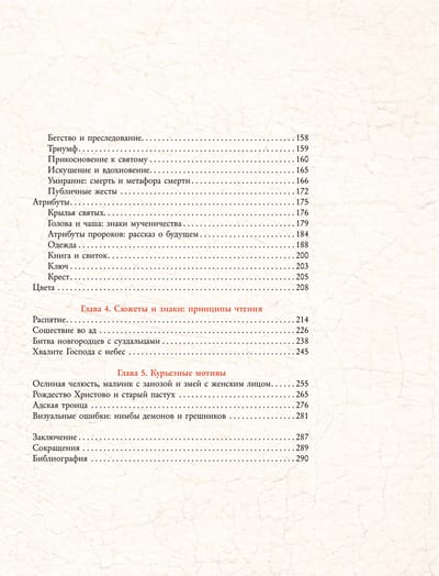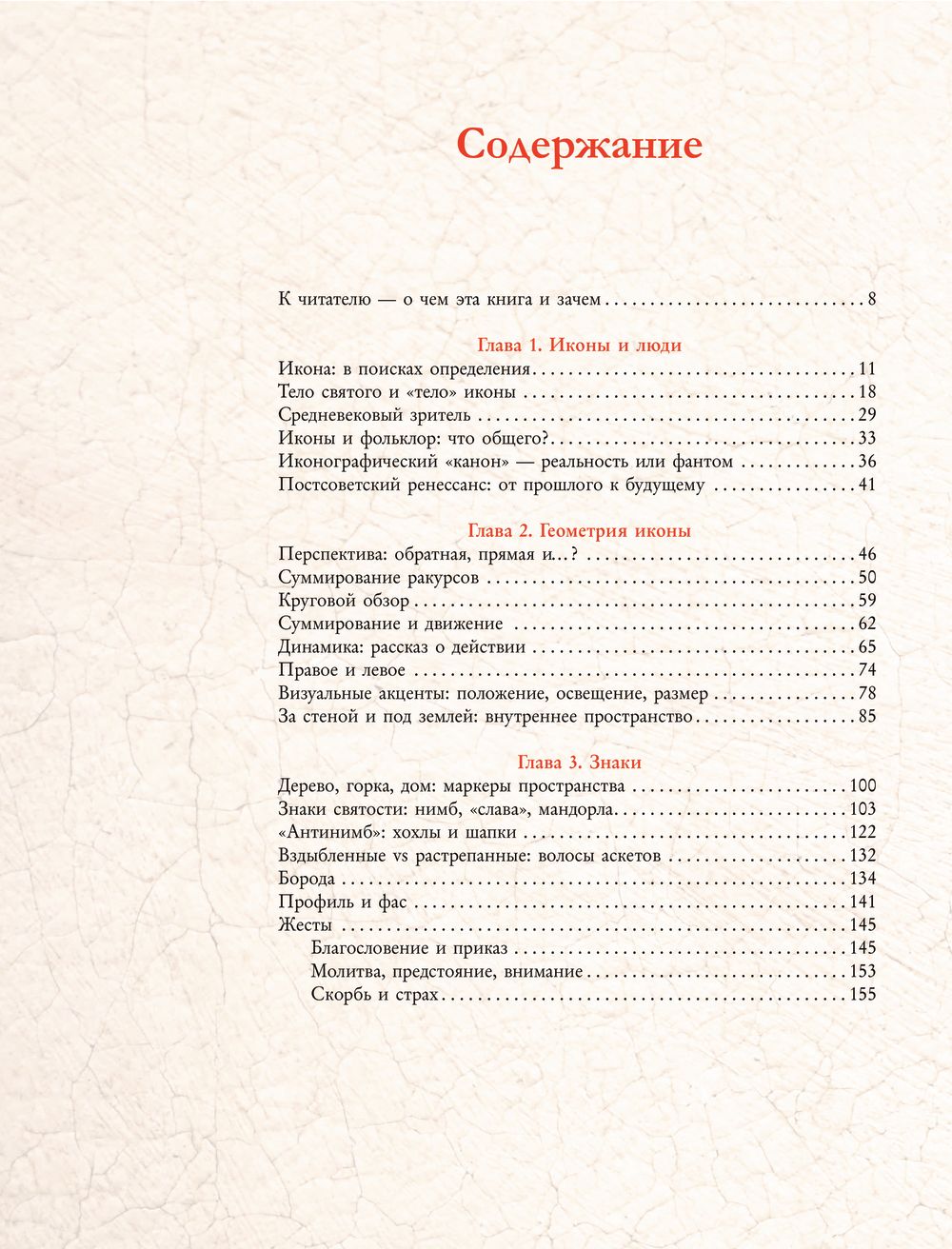 В первой главе описаны геометрические принципы, которые позволяют иконописцам рассказывать о пространстве и об изображаемых предметах. В следующих главах речь идет о знаках — малозаметных элементах, из которых строится любой визуальный рассказ, и о мотивах, повторяющихся в разных композициях. Наконец, в последней главе автор рассматривает необычные вариации некоторых сюжетов.