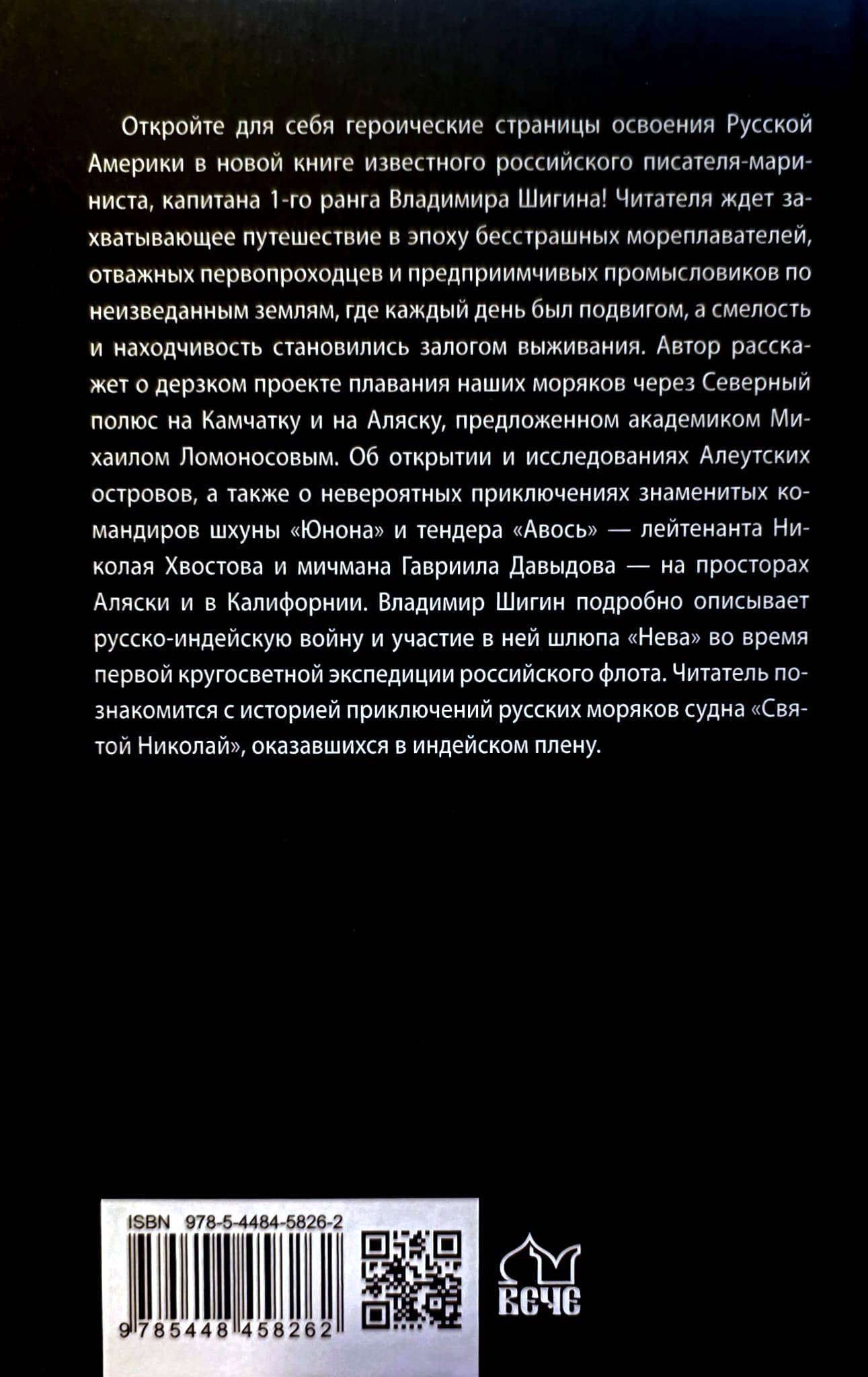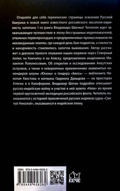 Читателя ждет захватывающее путешествие в эпоху бесстрашных мореплавателей, отважных первопроходцев и предприимчивых промысловиков по неизведанным землям, где каждый день был подвигом, а смелость и находчивость становились залогом выживания. Автор расскажет о дерзком проекте плавания наших моряков через Северный полюс на Камчатку и на Аляску, предложенном академиком Михаилом Ломоносовым. Об открытии и исследованиях Алеутских островов, а также о невероятных приключениях знаменитых командиров шхуны «Юнона» и тендера «Авось» — лейтенанта Николая Хвостова и мичмана Гавриила Давыдова — на просторах Аляски и в Калифорнии. Владимир Шигин подробно описывает русско-индейскую войну и участие в ней шлюпа «Нева» во время первой кругосветной экспедиции российского флота. Читатель познакомится с историей приключений русских моряков судна «Святой Николай», оказавшихся в индейском плену.