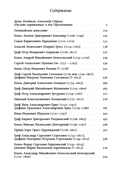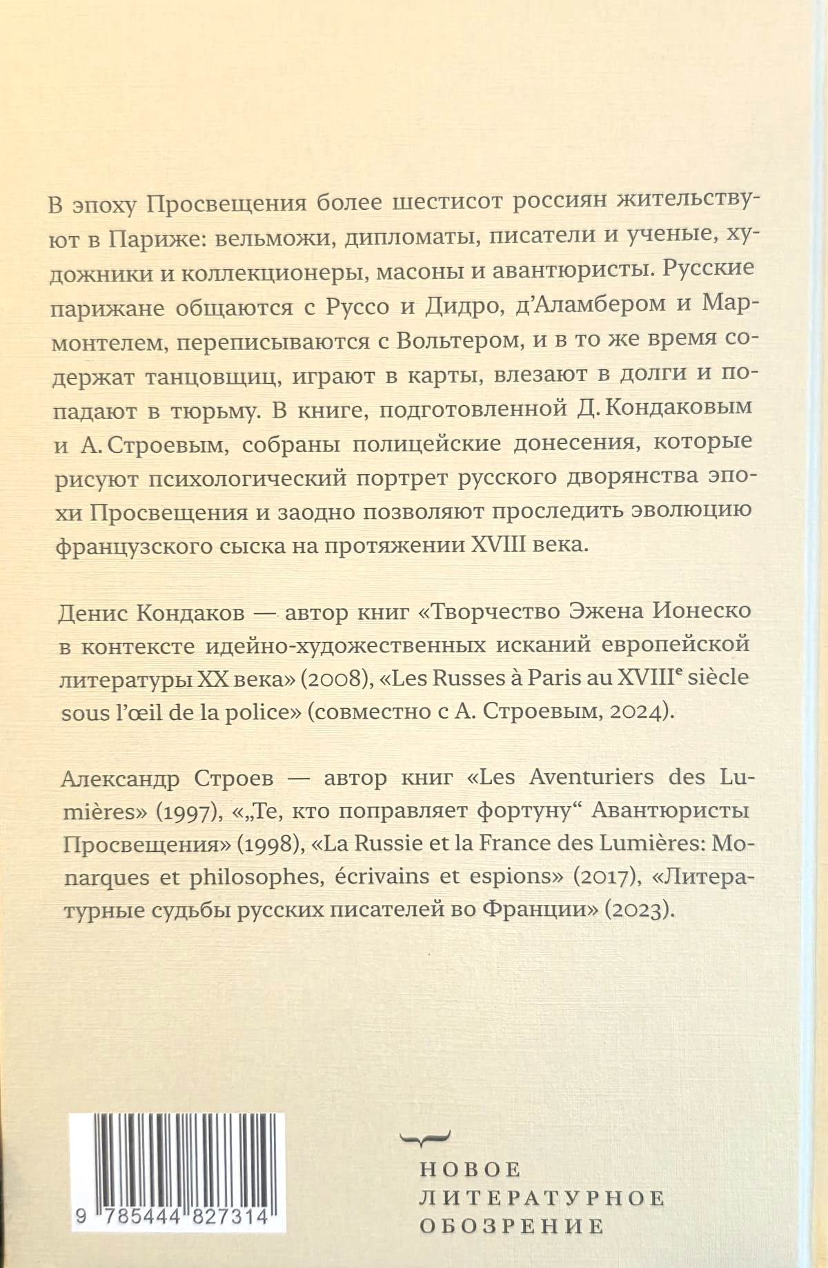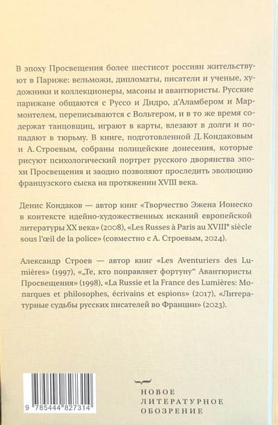 В книге, составленной Д. Кондаковым и А. Строевым, собраны полицейские донесения, которые рисуют психологический портрет русского дворянства эпохи Просвещения и заодно позволяют проследить эволюцию французского сыска на протяжении XVIII века.