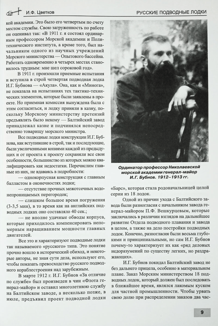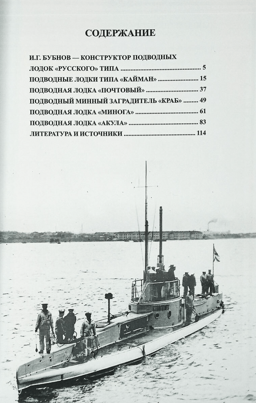 Книга открывается биографией конструктора подводных лодок «русского типа» Ивана Григорьевича Бубнова, с именем которого неразрывно связаны зарождение и развитие подводного кораблестроения в России. Его биография и есть по существу история подводного кораблестроения в России в период 1900–1917 годов. В книге подробно освещены вопросы разработки технических условий на проектирование подводных лодок, их устройство и оборудование, процесс постройки и приёмных испытаний, а также эксплуатация и боевая деятельность.