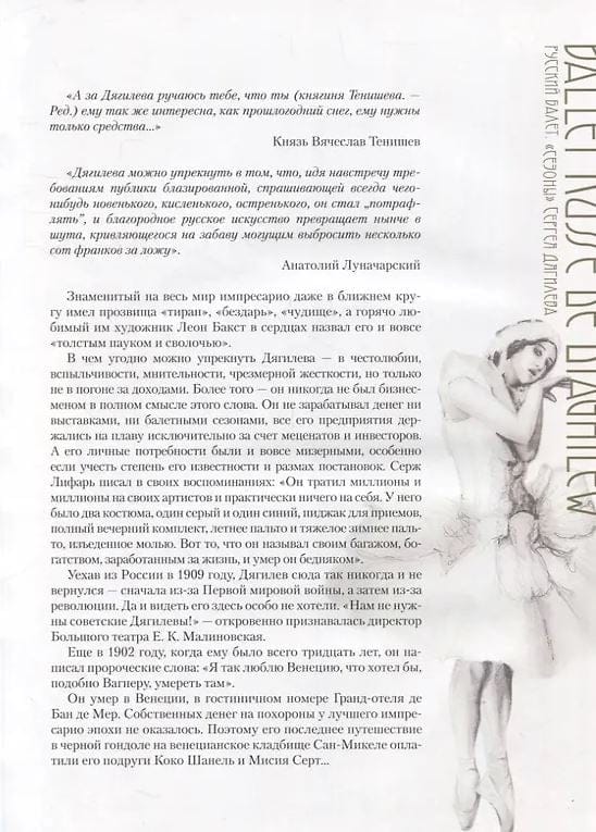 Эта книга едва ли не единственная на книжном рынке, собравшая всю палитру воспоминаний современников без сторонних комментариев и толкований. Об истории «Русских сезонов» рассказывают танцовщики и хореографы, художники и композиторы, чиновники и театральные критики, чьи откровения передают атмосферу начала ХХ века, когда русский балет и театр не только расширили рамки традиционного искусства, но и изменили облик всей мировой культуры.