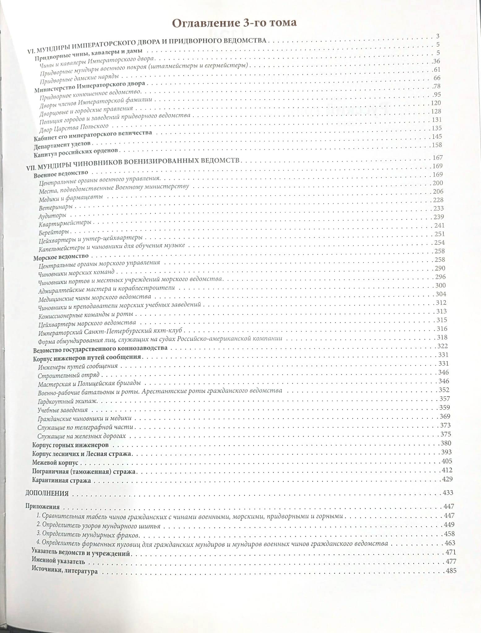 Третий, заключительный том издания посвящен форменной одежде чинов Императорского двора, придворных кавалеров и дам, классных чиновников придворного, военного и морского ведомств и служащих военизированных формирований гражданского ведомства. В заключении приведены определители узоров шитья, мундирных фраков и форменных пуговиц, а также справочный аппарат ко всему изданию.