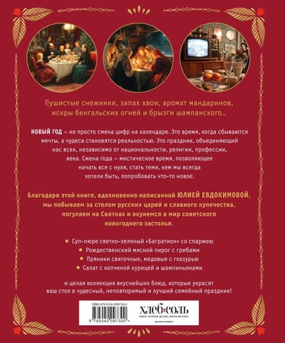 Юлия Евдокимова уже в который раз поражает новыми предложениями путешествий. Теперь это путешествие в глубину истории, в традиции самого любимого праздника, за накрытый вкуснейшими блюдами стол. Так давайте попробуем утку по-царски и буженину, маринованную в квасе; заливное из соленых грибов и курник; советские классические бутерброды со шпротами и салат «Мимоза» с его историей, и еще много увлекательных блюд.