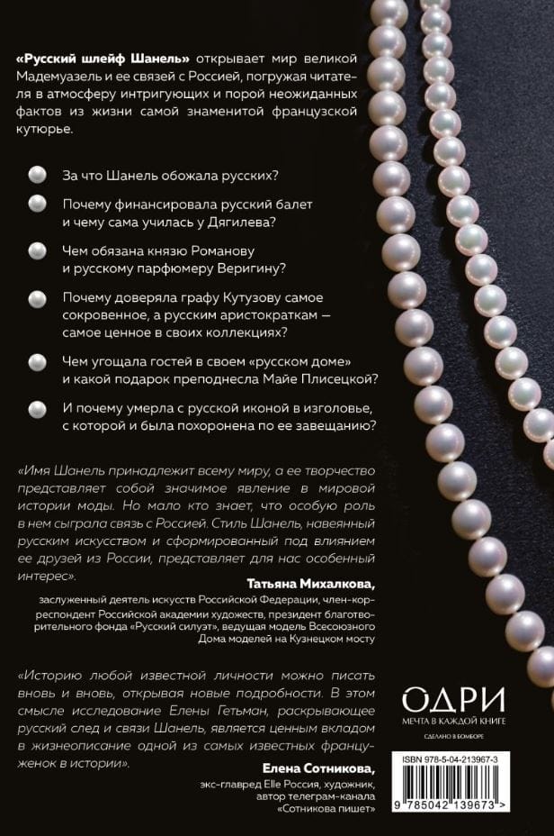 Вместе с Еленой Гетьман вы узнаете, откуда тянется русский шлейф Шанель, чему она научилась у русских и чем им обязана. Как дружба с русским импресарио Сергеем Дягилевым, композитором Игорем Стравинским, танцовщиками Сергеем Лифарем и Ольгой Хохловой помогла соединить в ее работах французскую элегантность с русскими традициями, породив тем самым новые модные веяния. А роман с Великим русским князем Романовым подарил миру самые знаковые изобретения бренда Chanel.
