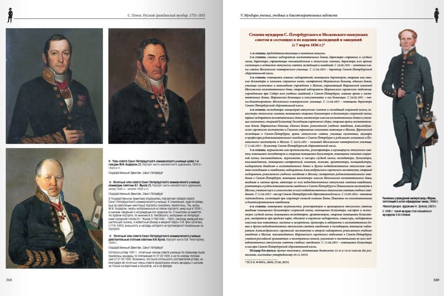 Книга посвящена истории гражданских мундиров в Российской империи в период их возникновения и регламентации во второй половине XVIII и первой половине XIX века. Издание представляет собой подробный справочник, подготовленный на основе анализа законодательных источников, архивных материалов и мемуаров современников. Впервые сведения о русских гражданских мундирах приводятся в наиболее полном и систематизированном виде. Текст книги подробно проиллюстрирован авторскими схематическими рисунками мундиров и шитья, историческими портретами чиновников в форменной одежде и другими изображениями.