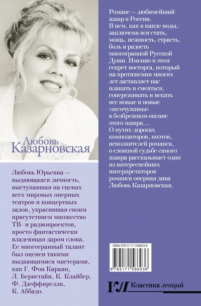 Романс – любимейший жанр в России. В нем как в капле воды заключена вся стать. мощь. нежность. страсть. боль и радость многогранной Русской Души. Именно в этом секрет восторга. который на протяжении многих лет заставляет нас плакать и смеяться. сопереживать и искать все новые и новые "жемчужины" в безбрежном океане этого жанра... О путях-дорогах композиторов. поэтов. исполнителей романса. о сложной судьбе самого жанра рассказывает один из интереснейших интерпретаторов романса. оперная дива Любовь Казарновская.