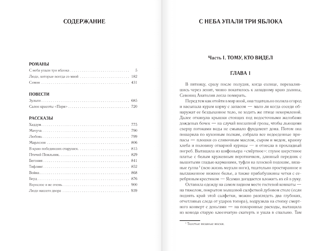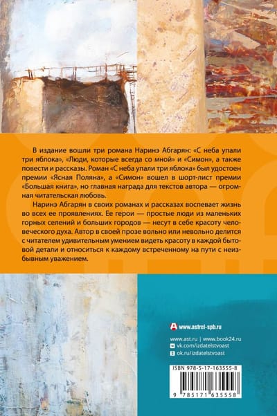 В издание вошли три романа Наринэ Абгарян: «Люди, которые всегда со мной», «С неба упали три яблока» и «Симон», а также повести и рассказы из сборника «Зулали».