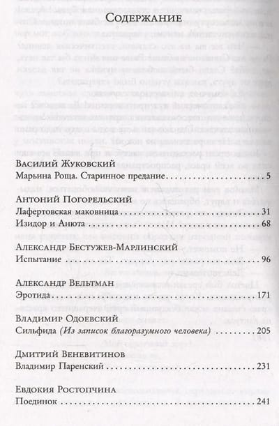 В сборник вошли редкие повести В. Жуковского, А. Погорельского, А. Бесстужева-Марлинского, А. Вельтмана, В. Одоевского, Д. Веневитова, Е. Растопчиной, А. Герцена, Е. Ган, А. Фета.