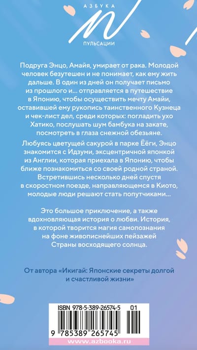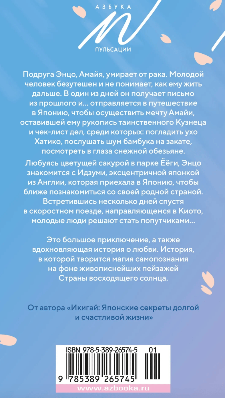 Подруга Энцо, Амайя, умирает от рака. Молодой человек безутешен и не понимает, как ему жить дальше. В один из дней он получает письмо из прошлого и… отправляется в путешествие в Японию, чтобы осуществить мечту Амайи, оставившей ему рукопись таинственного Кузнеца и чек-лист дел, среди которых погладить ухо Хатико, послушать шум бамбука на закате, посмотреть в глаза снежной обезьяне. Любуясь цветущей сакурой в парке Ёёги, Энцо знакомится с Идзуми, эксцентричной японкой из Англии, которая приехала в Японию, чтобы ближе познакомиться со своей родной страной. Встретившись несколько дней спустя в скоростном поезде, направляющемся в Киото, молодые люди решают стать попутчиками...