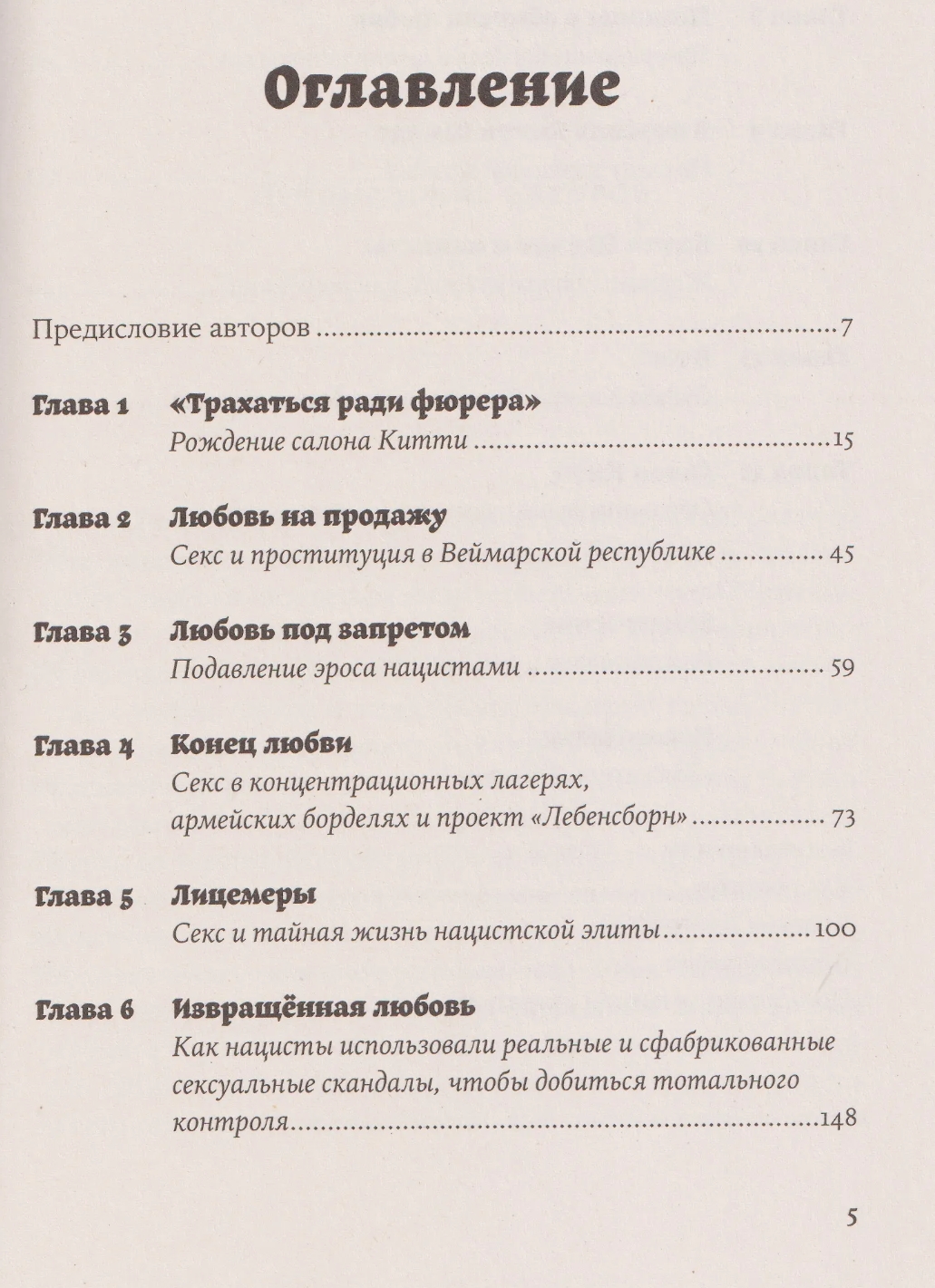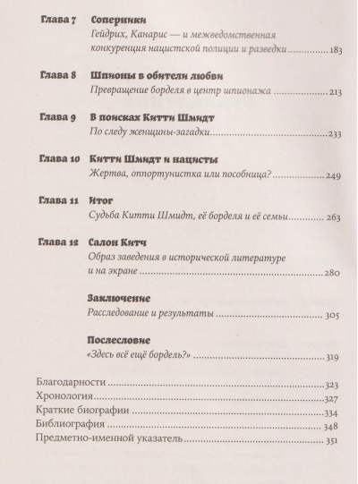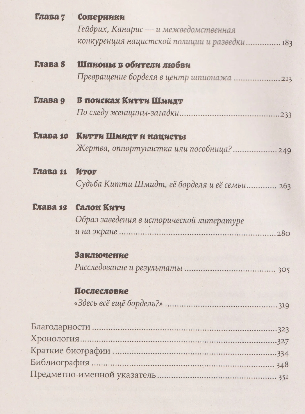 Международная команда историков на протяжении нескольких лет выясняла, что стоит за мифом о «Салоне Китти» — центре международного шпионажа, созданном нацистскими главарями на базе берлинского борделя средней руки. Кем была пресловутая Китти Шмидт — и почему ее «салон» продолжал работать и после войны? На что рассчитывали — и чего добились — Гейндрих и Шелленберг? Как островок «Веймарского Берлина» сохранился в гитлеровской Германии — и какие метаморфозы ему пришлось пережить? Как выглядела сексуальная повседневность граждан Третьего Рейха — и как одержимые вуайеризмом нацисты пытались регулировать рынок связанных с сексом услуг?
