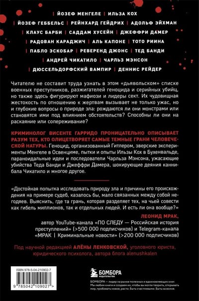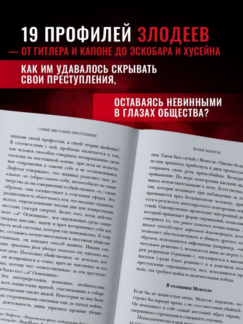 «Самые жестокие преступники» - это отвратительная коллекция злодеев не только среди серийных убийц, но и политических деятелей и нацистских преступников. У всех них, в разной степени, присутствует психопатия, патологический нарциссизм, склонность к садизму, параноидальная ментальность и умение скрывать свои преступления или казаться благодетелями. Автор книги глубоко анализирует причины их преступлений, мотивы и идеи, которым они слепо верили. Геноцид, организованный Гитлером, зверские эксперименты Менгеле в Освенциме, пытки и опыты Ильзы Кох в Бухенвальде, параноидальные идеи и последователи Чарльза Мэнсона, ужасающие убийства Теда Банди и Джеффри Дамера, шокирующие деяния каннибала Чикатило и многое другое.