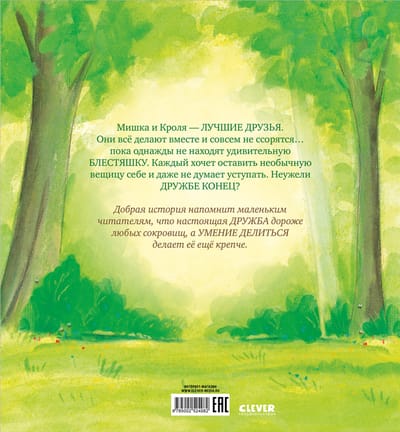 Мишка и Кроля — лучшие друзья. Они все делают вместе и совсем не ссорятся… Пока однажды не находят удивительную блестяшку. Каждый хочет оставить необычную вещицу себе и даже не думает уступать. Неужели дружбе конец? Добрая история книги для малышей напомнит маленьким читателям, что настоящая дружба дороже любых сокровищ, а умение делиться делает ее еще крепче.