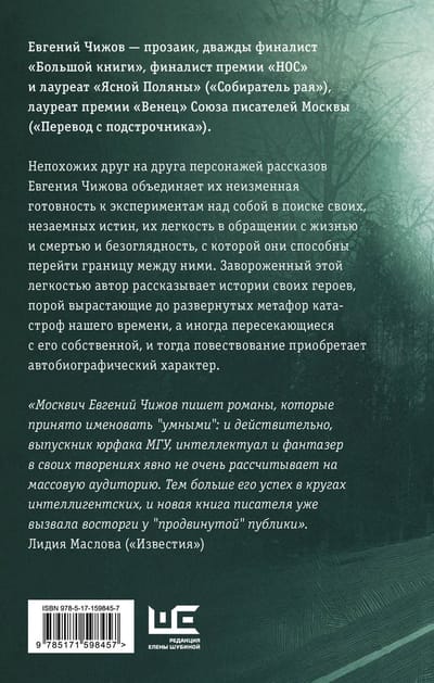 Евгений Чижов — прозаик, дважды финалист «Большой книги», финалист премии «НОС» и лауреат «Ясной Поляны» («Собиратель рая»), лауреат премии «Венец» Союза писателей Москвы («Перевод с подстрочника»).