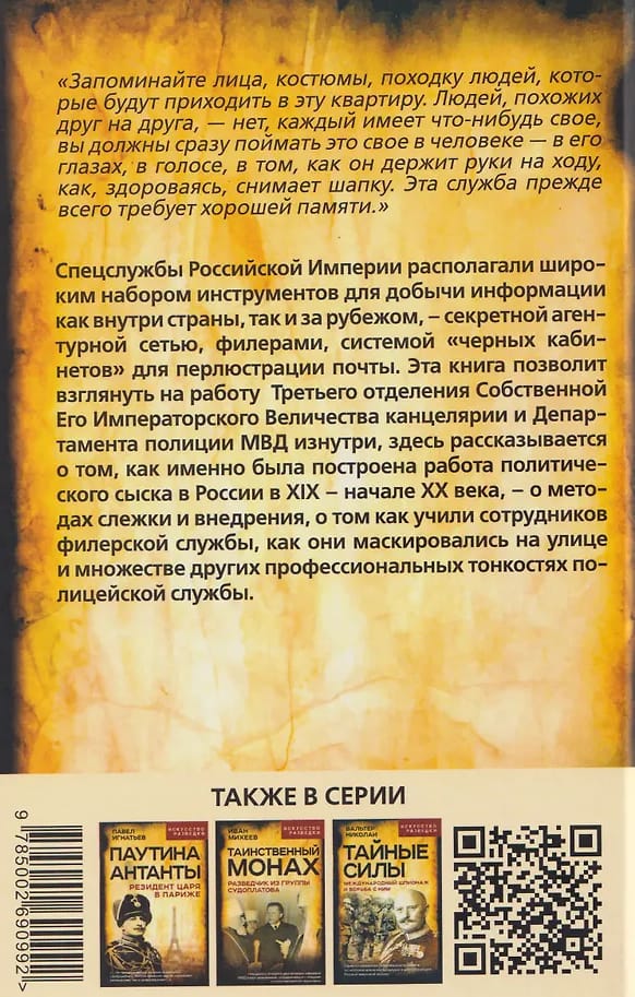 Спецслужбы Российской Империи располагали широким набором инструментов для добычи информации как внутри страны, так и за рубежом, – секретной агентурной сетью, филерами, системой «черных кабинетов» для перлюстрации почты. Эта книга позволит взглянуть на работу Третьего отделения Собственной Его Императорского Величества канцелярии и Департамента полиции МВД изнутри, здесь рассказывается о том, как именно была построена работа политического сыска в России в XIX – начале XX века, – о методах слежки и внедрения, о том как учили сотрудников филерской службы, как они маскировались на улице и множестве других профессиональных тонкостях полицейской службы.