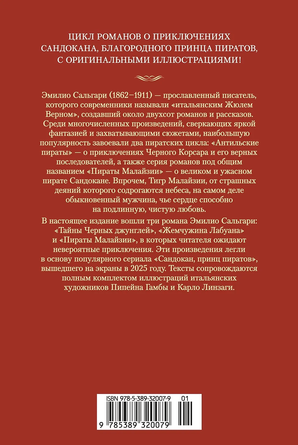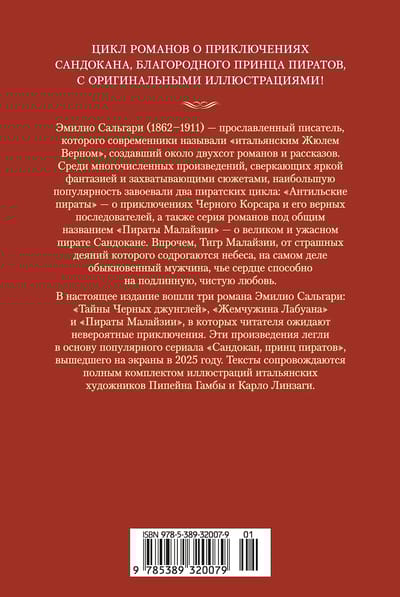 В настоящее издание вошли три романа Эмилио Сальгари: «Тайны Черных джунглей», «Жемчужина Лабуана» и «Пираты Малайзии», в которых читателя ожидают невероятные приключения. Эти произведения легли в основу популярного сериала «Сандокан, принц пиратов», вышедшего на экраны в 2025 году. Тексты сопровождаются полным комплектом иллюстраций итальянских художников Пипейна Гамбы и Карло Линзаги.